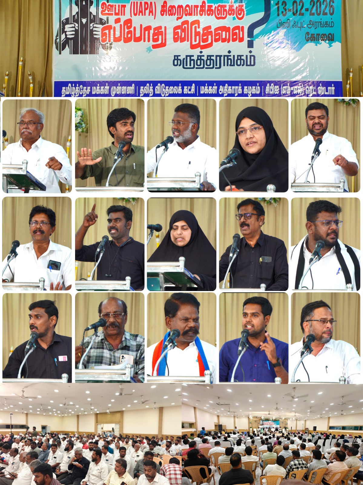 ஊபா(UAPA) சிறைவாசிகளுக்கு எப்போது விடுதலை? என்ற தலைப்பில் 22.11.2025 அன்று சென்னையிலும் 23-11-2025 அன்று திருச்சியிலும் தமிழ்த்தேச மக்கள் முன்னணியின் முன்னெடுப்பில் கருத்தரங்குகள் நடைபெற்றன. இதை தொடர்ந்து 13-2-2026 ஆம் நாள் வெள்ளிக்கிழமை அன்று கோவையில் இதே தலைப்பில் தமிழ்த்தேச மக்கள் முன்னணி, தலித் விடுதலைக் கட்சி, மக்கள் அதிகாரக் கழகம், சிபிஐ(எம்-எல்) ரெட் ஸ்டார் ஆகிய அமைப்புகளின் ஒருங்கிணைப்பில் கருத்தரங்கம் நடைபெற்றது.
